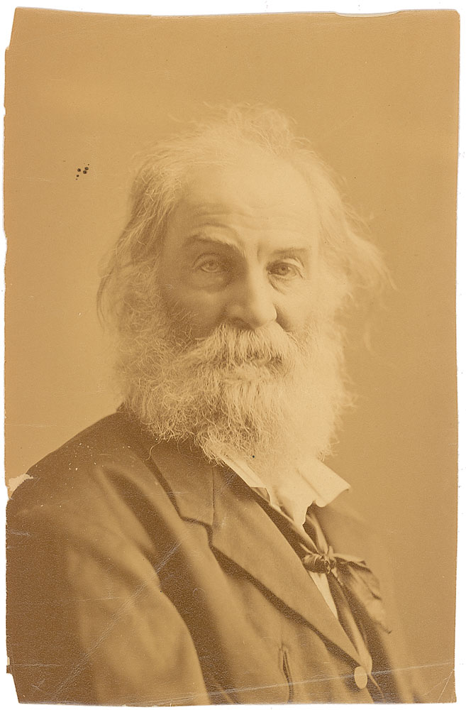 Original 5 x 7.5 albumen print photo of Whitman in a coat and tie. In very good condition, with some scattered light wrinkling, edge wear and chips, and some silvering to darker areas of image. RR Auction COA.