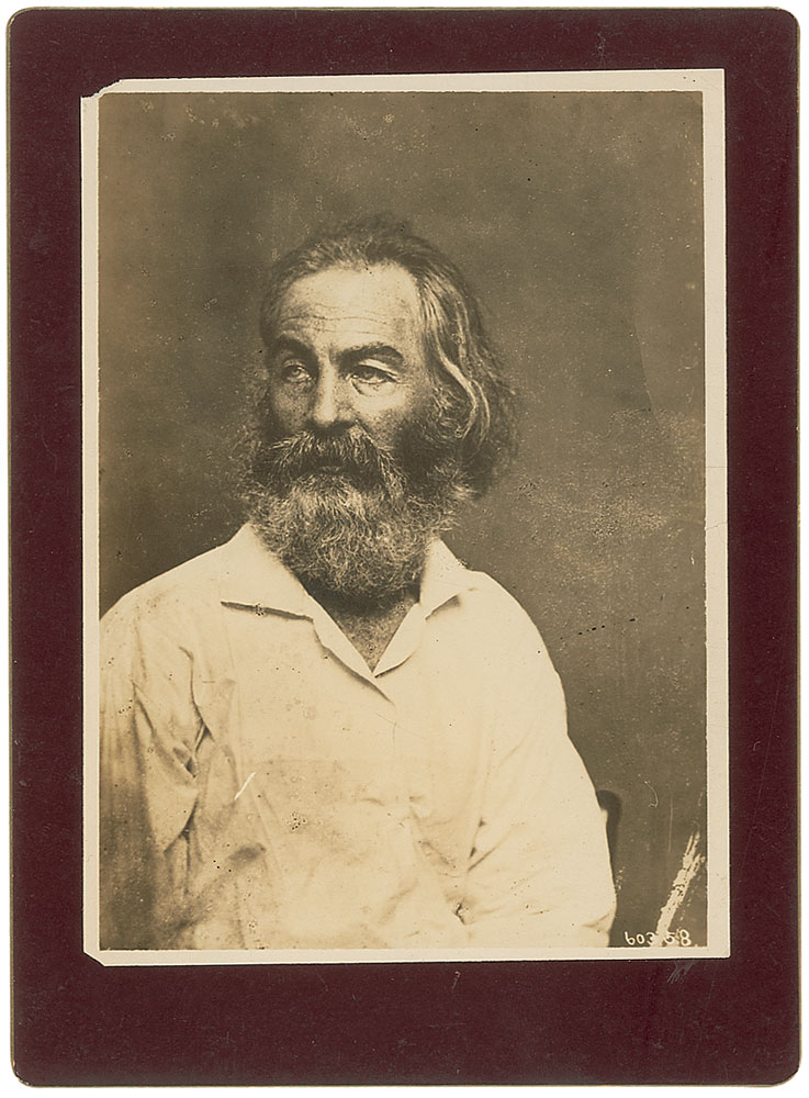 Glossy 4.25 x 6 photo of a younger Whitman, with an identification number of “60358,” printed in the lower right. Photo is affixed to a 5 x 7 mount. In fine condition, with missing left corner tips, scattered light surface marks, and a few creases and ripples. RR Auction COA.