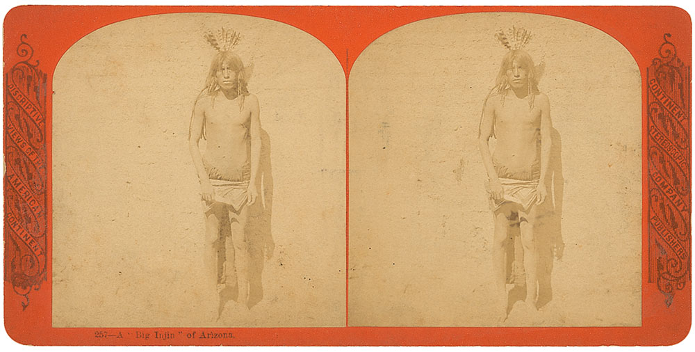 Original stereoview of “A ‘Big Injin’ of Arizona,” 7 x 3.25, by the Continent Stereoscopic Company. Reverse bears an advertisement for a book entitled Conklin’s Picturesque Arizona. Scattered marks and spots to the images, otherwise fine condition. RR Auction COA.