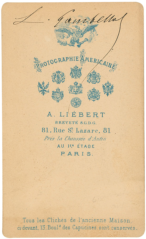 French republican statesman (1838-1882) who helped direct the defense of France during the Franco-German War of 1870–71. Uncommon original 2.25 x 4 carte-de-visite photo by A. Liebert of Paris, signed on the reverse in black ink, “L. Gambetta.” In fine condition, with pencil notation mentioning “Goodspeed” in bottom border, and some light toning and pencil remnants to reverse. Gambetta is rare in any form. RR Auction COA.
