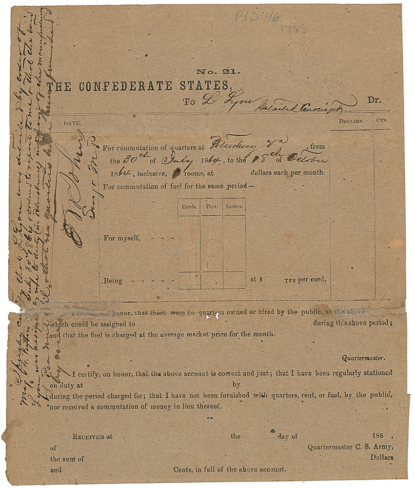 Unissued war-dated Confederate states receipt, one page, 7.75 x 11, 1864. A receipt for L. Lyon for commutation of quarters from July 30, 1864, to October 18, 1864, with a endorsement by J. W. Johns written along the left edge. In very good condition, with tape repairs to a separation along a horizontal fold, a bit of light paper loss, scattered toning and spotting, and a pencil notation along top edge. RR Auction COA.