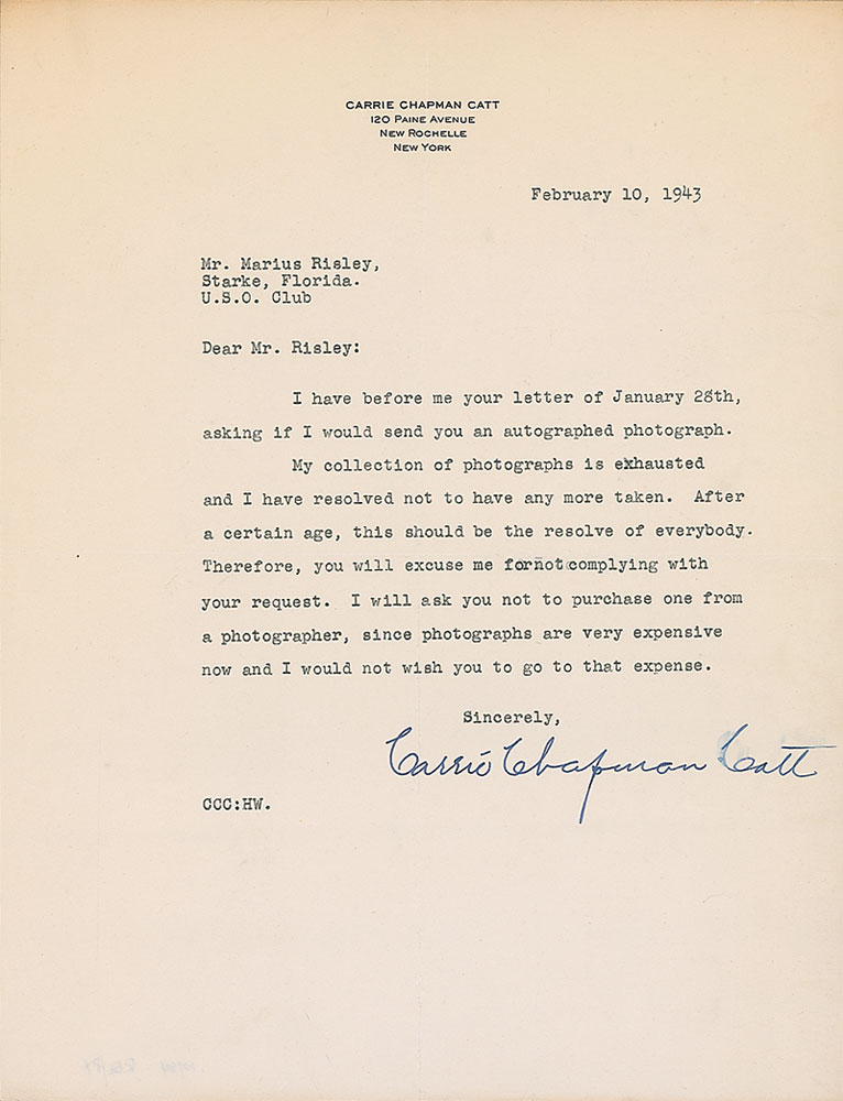American suffragist and peace activist (1859–1947) who was one of the leading forces behind the adoption of the Nineteenth Amendment in 1920, ensuring women the right to vote. TLS, one page, 8.5 x 11, personal letterhead, February 10, 1943. Letter to an admirer. In part: “My collection of photographs is exhausted and I have resolved not to have any more taken. After a certain age, this should be the resolve of everybody.” In fine condition, with some brushing to the end of the signature. RR Auction COA.