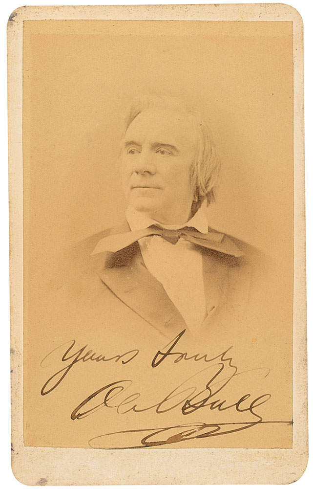 Norwegian violinist (1810–1880), often called Norway’s first international star. Original 2.5 x 4 carte-de-visite photo by Eduard, signed below the image in black ink, “Yours truly, Ole Bull.” In fine condition, with mounting remnants to reverse. RR Auction COA.