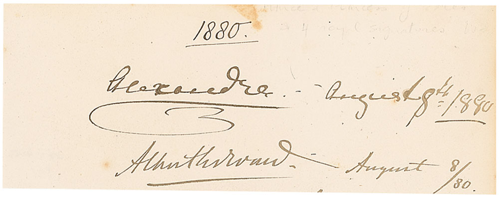 Prince of Wales and first British monarch of the House of Saxe-Coburg and Gotha, Edward’s reign (1901–1910) was named the Edwardian era. Ink signatures, “Alexandra—August 8th, 1880,” and “Albert Edward, August 8/80,” on an off-white 7 x 2.75 off-white slip. In fine condition, with a bit of scattered light toning and light pencil remnants along top edge. Accompanied by two unsigned cartes-de-visite. RR Auction COA.