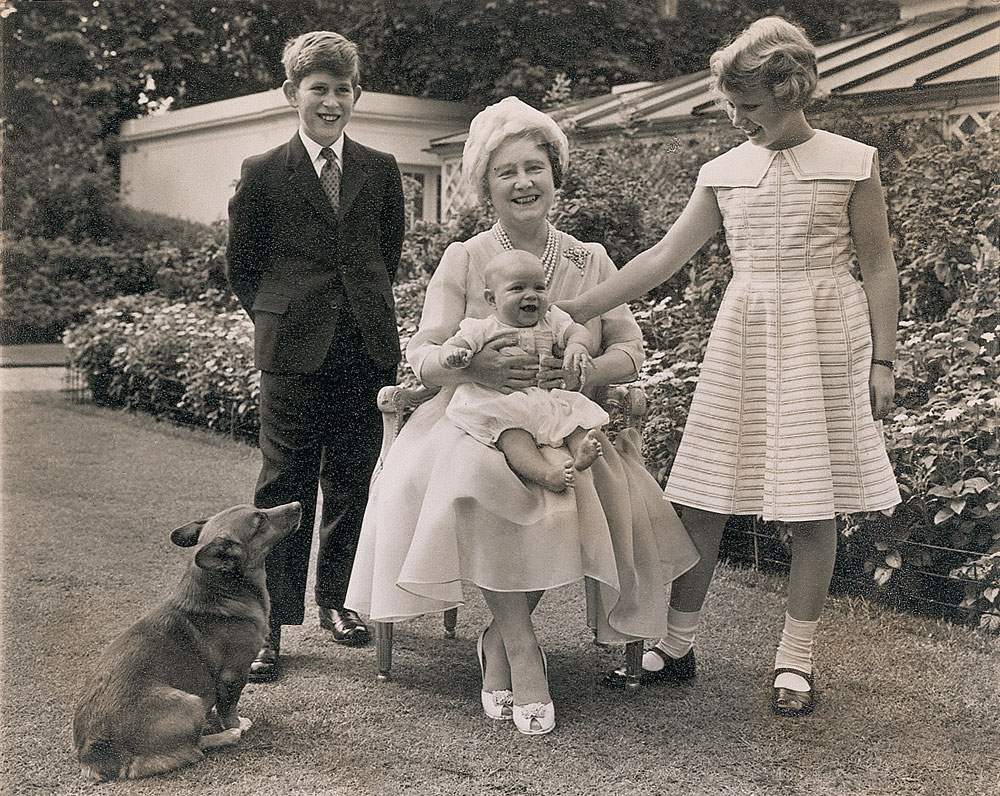 Original vintage matte-finish 7 x 5.5 photo of the Queen Mother in the garden of Clarence House on the occasion of her 60th birthday in 1960, with her grandchildren Prince Charles, Princess Anne, and an almost six-month-old Prince Andrew. In fine condition, with some scattered light silvering and mounting remnants on reverse. RR Auction COA.