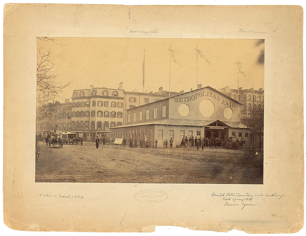 Original 10.25 x 6.5 photo of a building at the 1864 Metropolitan Fair by Otto Ebbinghaus & Swift of New York, affixed to its original 13.5 x 10.25 photographer’s mount. Mount is captioned in an unknown hand, “United States Sanitary Fair buildings, held Spring 1864, Union Square.” In very good condition, with scattered surface marks, other pencil notations to mount, paper loss to bottom edge, and scattered small creases and tears. RR Auction COA.