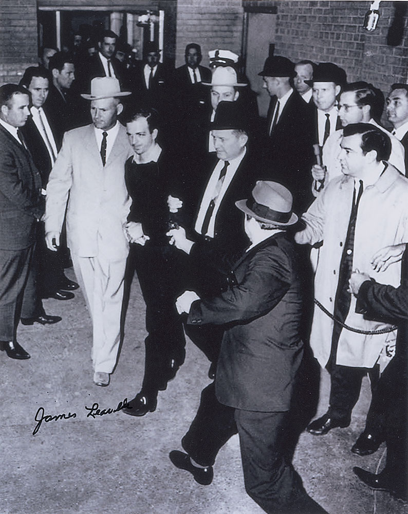 Satin-finish 8 x 10 photo of Leavelle escorting Lee Harvey Oswald, with Jack Ruby lunging at Oswald with a gun, signed in the lower left in black felt tip. In fine condition. RR Auction COA.