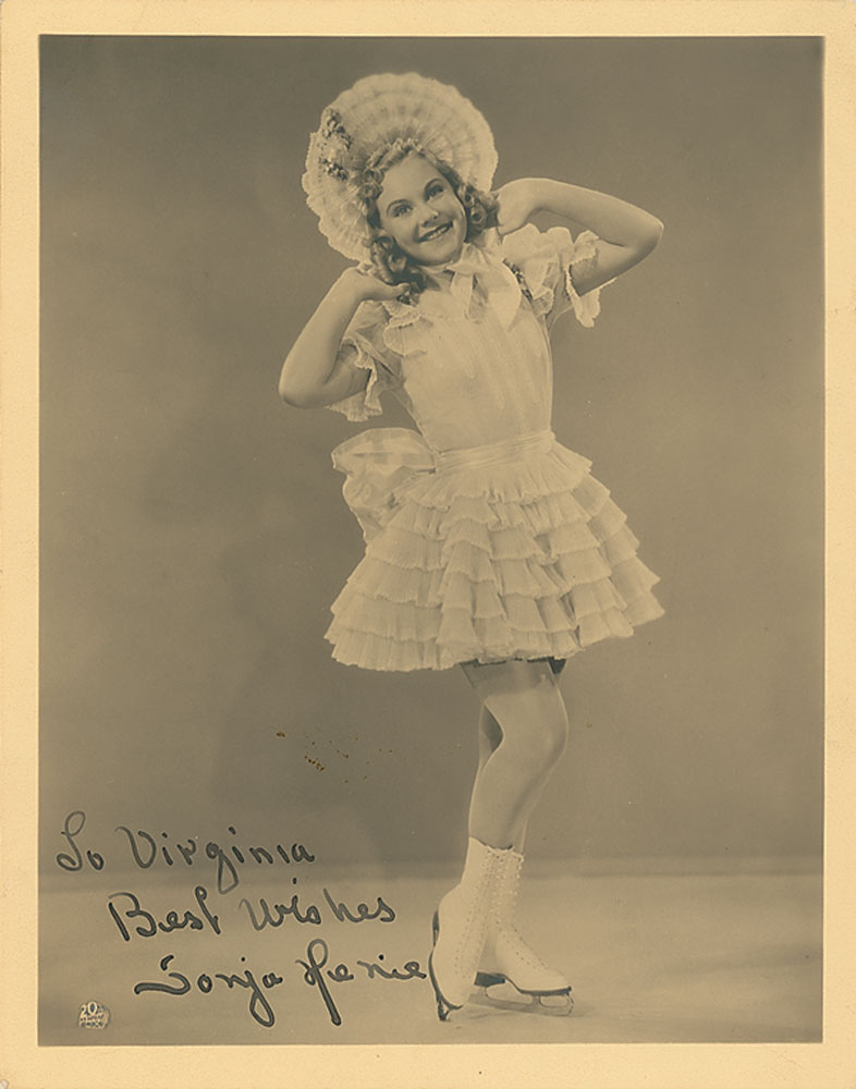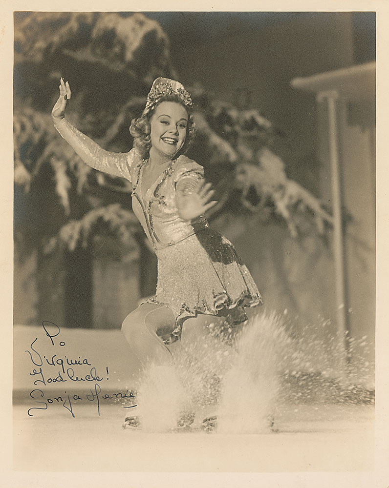 Two vintage matte-finish photos of Henie on skates, one 8 x 10 and one 5.5 x 7, each signed and inscribed in fountain pen to Virginia. In fine condition, with a bit of light silvering to edges of larger photo. Pre-certified PSA/DNA and RR Auction COA.
