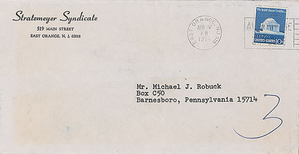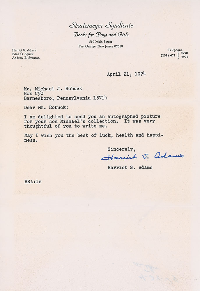Prolific author and publisher of juvenile mystery books, including books in the Nancy Drew and Hardy Boys series (1892–1982). TLS, 7.25 x 10.5, Stratemeyer Syndicate letterhead, April 21, 1974. Letter to an admirer, responding to an autograph request. In fine condition. Accompanied by the original mailing envelope. RR Auction COA.