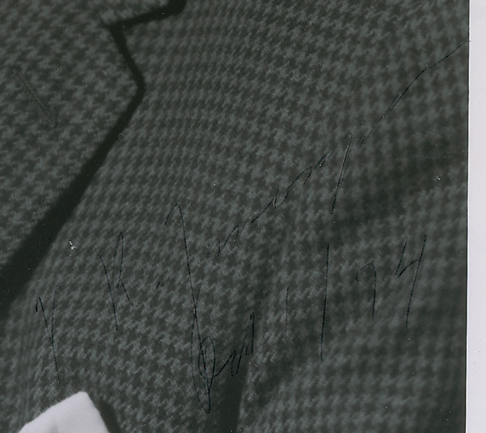 Russian-American engineer and inventor of the iconoscope and kinoscope that, together, constituted the first all-electronic television system (1888–1982). Uncommon glossy 8 x 10 portrait of Zworykin, signed in the lower right in ballpoint, “V. K. Zworykin, Oct. 1/74.” In very good condition, with a crease to the upper left and very poor contrast to signature against the checkered pattern of his suit. RR Auction COA.