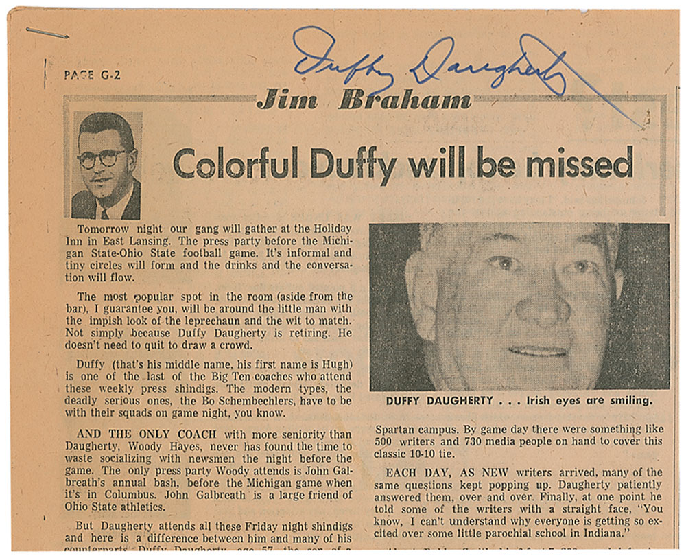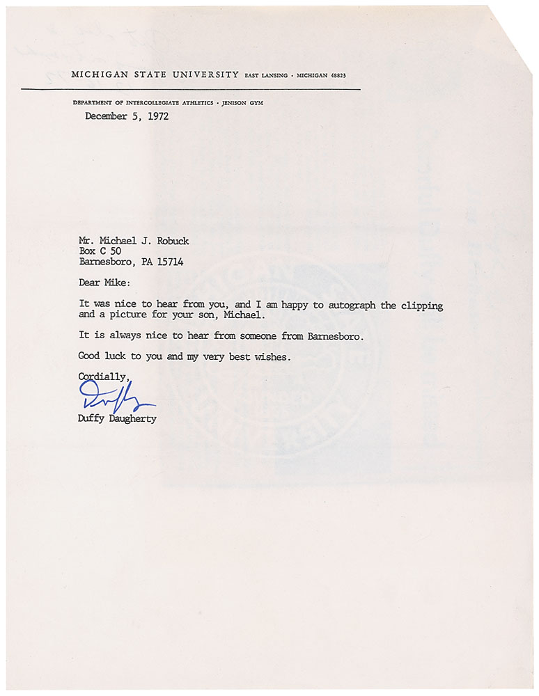 Football coach (1915–1987) who served as the head coach at Michigan State University from 1954 to 1972, winning two national championships. TLS signed “Duffy,” one page, 8.5 x 11, Michigan State University letterhead, December 5, 1972, responding to an autograph request. Stapled to the letter is a newspaper article about his retirement, 7.25 x 6, signed at the top in blue felt tip, “Duffy Daugherty.” In fine condition, with overall toning to the article, and a vertical fold passing through a single letter of the signature. Pre-certified Steve Grad/PSA/DNA and RR Auction COA.