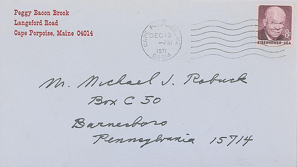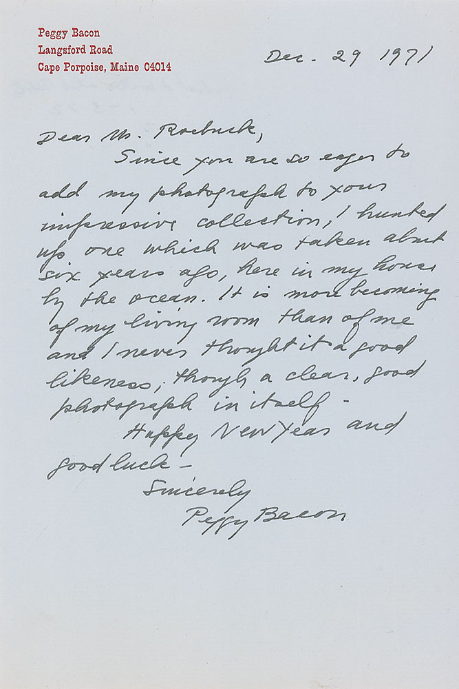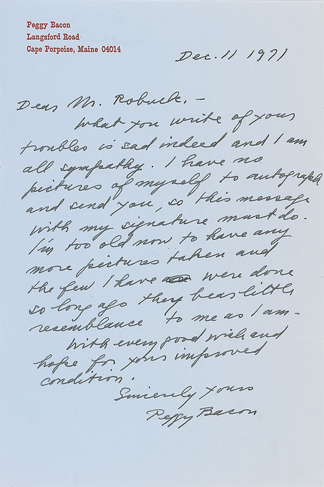 American artist (1895–1987) best known for her satirical caricatures. Two ALSs, each one page, 6 x 9, personal letterhead, December 11 and 29, 1971. Both responses to an autograph request. The second, regarding a photo, in part: “It is more becoming of my living room than of me and I never thought it a good likeness; though a clear, good photograph in itself.” In overall very fine condition. Accompanied by the original mailing envelope for one, filled out in Bacon’s hand. RR Auction COA.