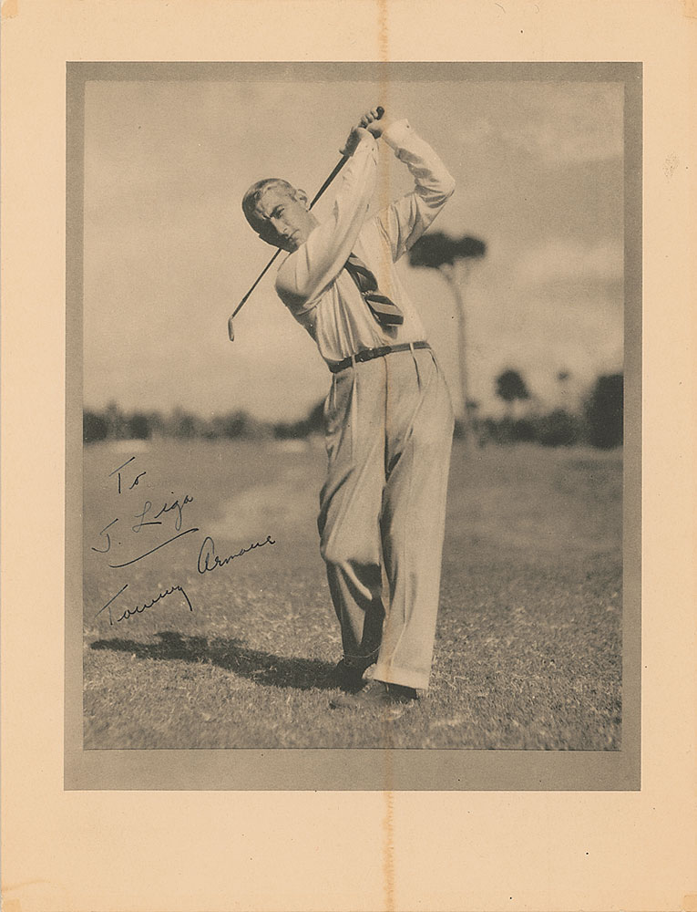 American golfer (1894–1968) who, despite suffering a severe eye injury during World War I, went on to win three major titles. He was elected to the World Golf Hall of Fame in 1976. Vintage 8.5 x 11 photo of Armour taking a swing with his iron, signed and inscribed in fountain pen “To J. Liga, Tommy Armour.” A thin central vertical line of toning through image and small blocks of toning to each corner tip, otherwise fine condition. Pre-certified Steve Grad/PSA/DNA and RR Auction COA.