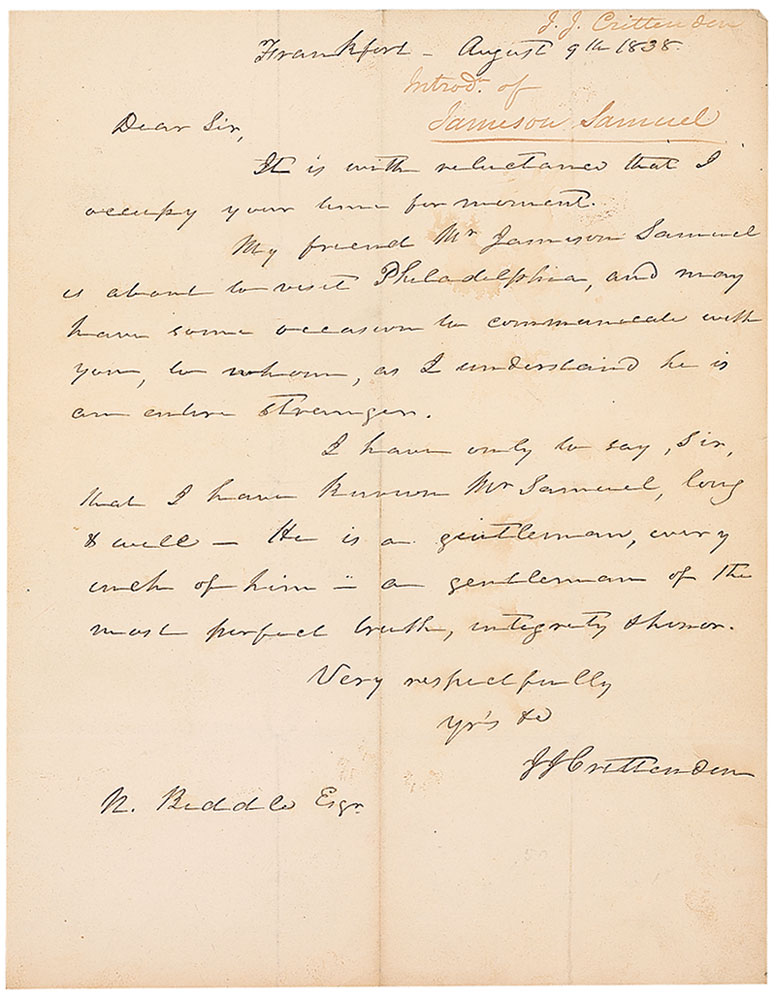 Politician (1787–1863) who served as governor of Kentucky, and attorney general under Harrison, Tyler, and Fillmore. ALS signed “J. J. Crittenden,” one page, 8 x 10, August 9, 1838. Letter of introduction to bank president Nicholas Biddle. In part: “I have known Mr. Samuel long & well—He is a gentleman, every inch of him—a gentleman of the most perfect truth, integrity, and honor.” Second integral sheet bears an address panel filled out in Crittenden’s hand, and letter bears docketing in an unknown hand to the upper right. Intersecting folds (one vertical fold passing through a single letter of the signature), light scattered soiling, and a mounting strip to left border, otherwise fine condition. Accompanied by an engraved portrait of Crittenden. RR Auction COA.