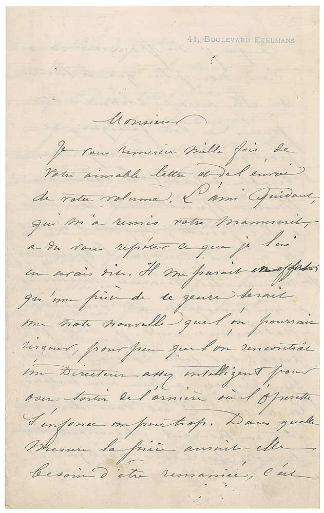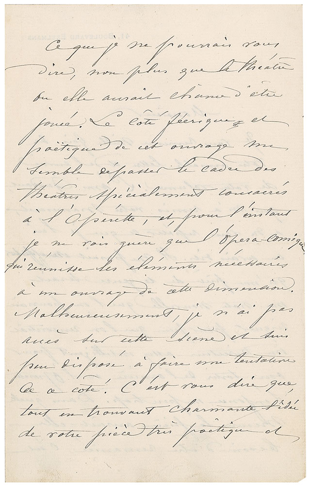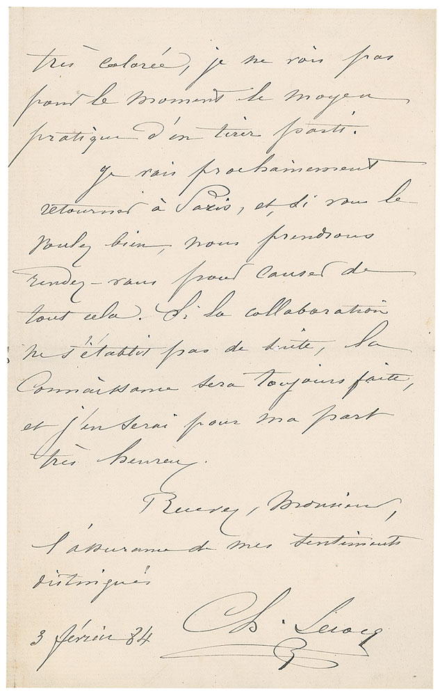 French musical composer (1832–1918) best-known for La fille de Madame Angot. ALS in French, signed “Ch. Lecocq,” three pages on two adjoining sheets, 5 x 8, personal letterhead, February 3, 1884. Letter to an aspiring composer or librettist. In part (translated): “It seems to me a work of this sort would strike a new note which one might be tempted to risk, if only one could find a director sufficiently intelligent to dare climb out of the rut in which operetta has steeped itself. To what extent the operetta would have to be reworked is something I would not be able to tell you; nor can I tell the theatre where it would have a chance of being performed. The fairylike and poetic aspect of this work seems to me to go beyond the framework of the theatres especially devoted to operetta.” In fine condition, with mild creases and soiling. RR Auction COA.