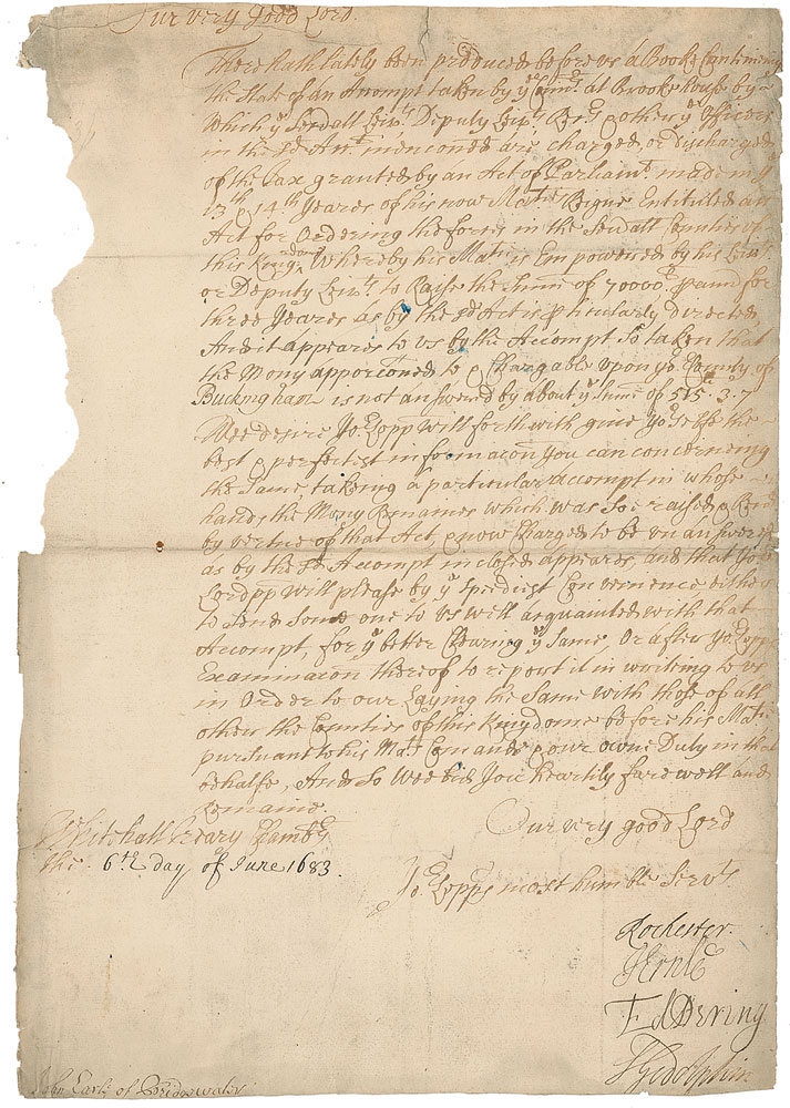 LS, one page, 9.5 x 13.5, Whitehall Treasury Chambers, June 6, 1683. Letter from the Lords of the Treasury to “John, Earl of Bridgewater,” asking for a response to charges that he has withheld a portion of his taxes. Signed at the conclusion by Laurence Hyde as “Rochester,” “S. Godolphin,” “J. Ernle,” and “Ed. Dering.” In very good condition, with overall creases, light scattered soiling, paper loss to left border, and a few tape-repaired edge tears. RR Auction COA.
