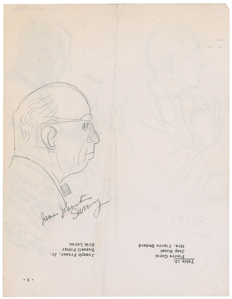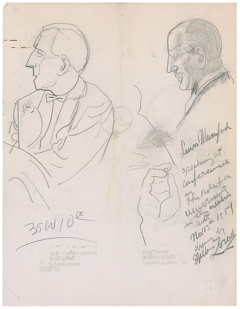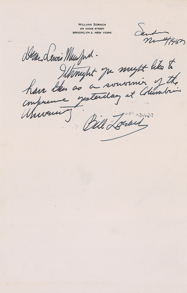 Sculptor, painter, printmaker, and writer (1887-1966). Two original vintage pencil sketches of Lewis Mumford by Zorach on the reverse of an 8.5 x 11 sheet bearing a seating list for a table. The sketches are two bust-length portraits of Mumford and a small drawing of his hand. Beneath one sketch Zorach has written, “Lewis Mumford speaking at conference on The Role of a University in the Creative Arts—Nov. 13th, 1957—drawn by Wllm Zorach.” On the reverse of the sheet is another pencil sketch of a man identified by Zorach as James Johnston Sweeney. Accompanied by a short ALS, signed “Bill Zorach, one page, 6.5 x 10, personal letterhead, November 14, 1957. Zorach sends a short letter to Mumford, in full: “I thought you might like to have this as a souvenir of the conference yesterday at Columbia University.” Sketches are in fine condition, with a central vertical fold to sheet, staple hole to lower left, and some light creasing and soiling. Letter also rates fine, with a central vertical fold and some light mirroring of ink. Scarce original works from an uncommon American sculptor. RR Auction COA.