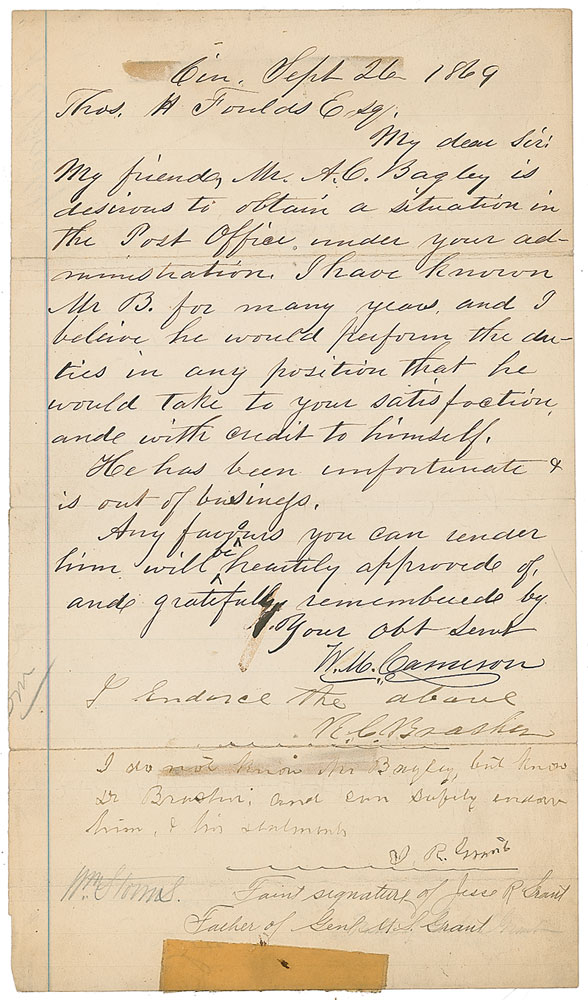 Father of President U. S. Grant (1794–1873). Handwritten endorsement, signed “J. R. Grant,” at the conclusion of an LS, one lightly-lined page, 6.75 x 11.75, September 26, 1869, recommending a gentleman for a position at the post office. Grant writes in support of another endorsement, “I do not know Mr. Bagley, but know Dr. Brasher; and can safely endorse him, & his statements.” In very good condition, with multiple horizontal folds with slight separations, scattered toning and soiling, toned tape remnant to the lower border, and ink notation identifying Grant’s signature. RR Auction COA.