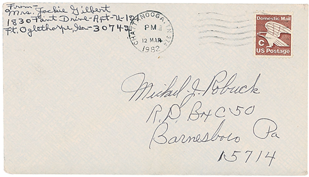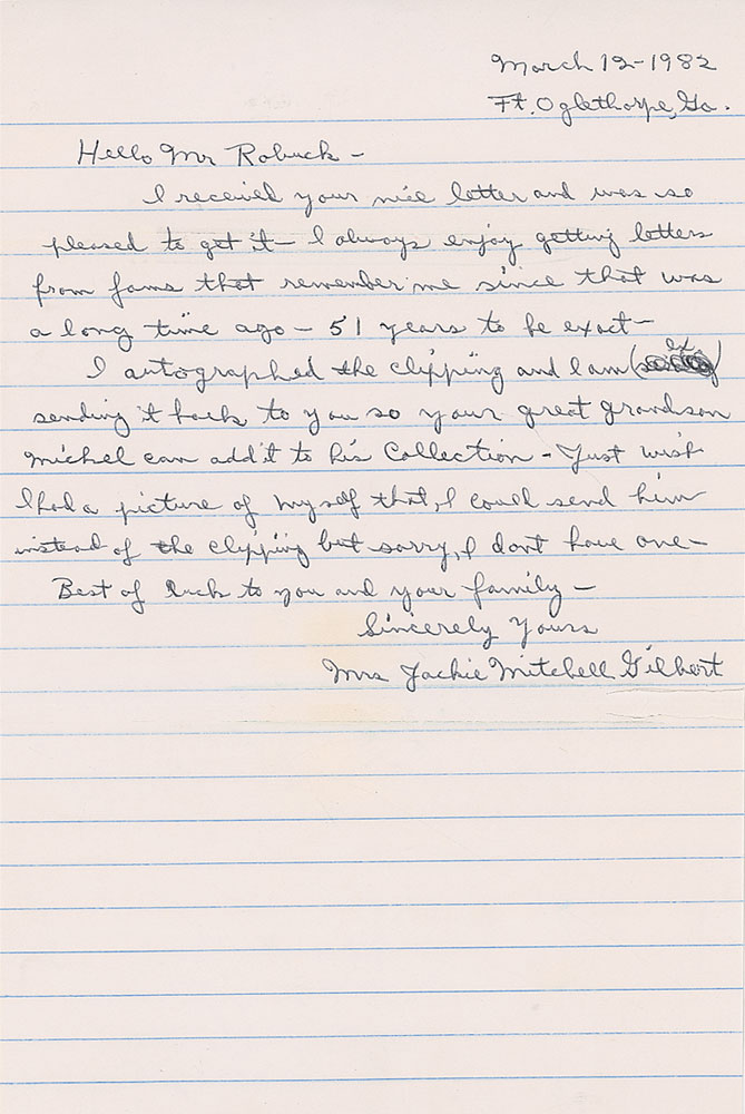 One of the first female pitchers in professional baseball history, who struck out Babe Ruth and Lou Gehrig in an exhibition game (1912–1987). ALS, one page, lightly-lined, 6 x 9, March 12, 1982. Letter to an admirer. In part: “I always enjoy getting letters from fans that remember me since that was a long time ago—51 years to be exact.” A small tear below the signature, otherwise fine condition. Accompanied by the original mailing envelope, which also bears her signature in the return address area. Pre-certified Steve Grad/PSA/DNA and RR Auction COA.