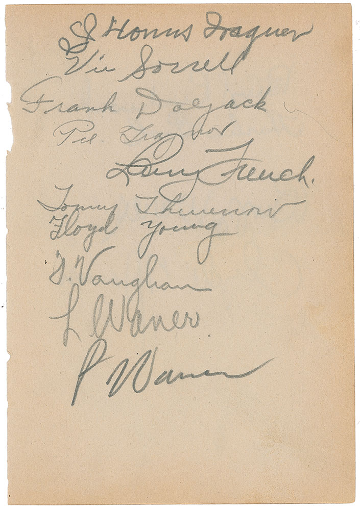 Vintage pencil signatures of Wagner and 13 members of the Pittsburgh Pirates and Detroit Tigers (circa 1933–1934) on both sides of an off-white 4.5 x 6.75 album page. Signers include: “J. Honus Wagner,” L[loyd] Waner, P[aul] Waner, Pie Traynor, A[rky] Vaughan, Vic Sorrell, Frank Doljack, Larry French, Floyd Young, Harlin Pool, and Buzzy Wares. In fine condition, with some mild edge toning. Accompanied by a letter of authenticity from James Spence. Pre-certified Steve Grad/PSA/DNA and RR Auction COA.