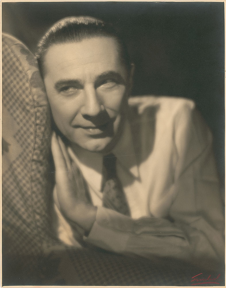 Wonderful vintage oversized 10.5 x 13.5 photo of Lugosi, bathed in soft light, resting his head against a chair. Photo is stamped on the reverse, “Bela Lugosi featured in Universal Pictures.” Photo was taken in the early 1930s, with photographer’s signature in red pencil in the lower right corner, and a Don Marlowe Agency stamp on the reverse. Photo was originally owned by Lugosi and given to Marlowe to promote his career. In fine condition, with some scattered light horizontal ripples and light edge curling. A magnificent portrait of the horror star as he attempts to break his typecast as a horror-only actor. Lugosi lost out on several roles to the likes of Lionel Barrymore (Rasputin and the Empress) and Basil Rathbone (Tovarich). RR Auction COA.