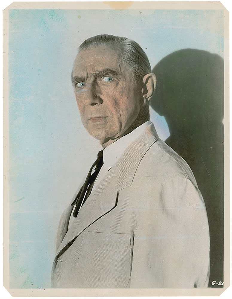 Original vintage color-tinted glossy 8 x 10 photo of Lugosi as Dr. Zabor in the 1952 film Bela Lugosi Meets a Brooklyn Gorilla. Clipped corner tips, spot of toning along top edge, and a few light creases and surface marks, otherwise fine condition. RR Auction COA.