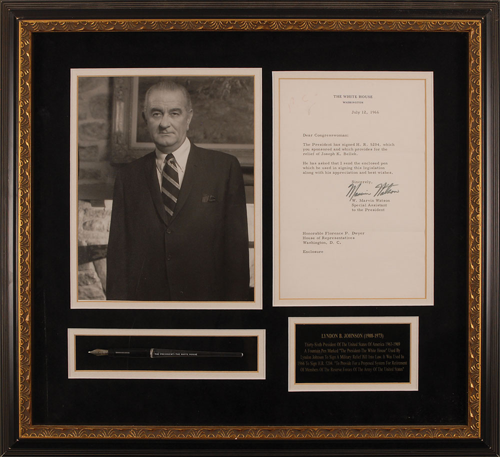 TLS, signed by Johnson’s Special Assistant W. Marvin Watson, one page, 6 x 9, White House letterhead, dated July 12, 1966. Letter to Congresswoman Florence P. Dwyer reads, in full: “The President has signed H. R. 5204, which you sponsored and which provides for the relief of Joseph K. Bellek. He asked that I send the enclosed pen which he used signing this legislation along with his appreciation and best wishes.” The Brooks fountain pen measures 6.25″ long with “The President—The White House,” printed in white lettering on the handle. This pen was used in 1966 to sign H. R. 5204 “to Provide for a Proposed System for Retirement of members of the Reserve Forces of the Army of the United States.” Double-matted and framed with a portrait and an informational plaque to an overall size of 20.5 x 19. In fine condition, with a couple light notations to letter. RR Auction COA.