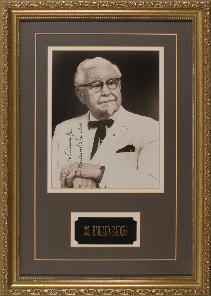 Ribbon-tie-and-white-suit-wearing fried chicken tycoon (1890-1980). Glossy 7 x 9 photo of Sanders in his trademark white suit, signed vertically in black felt tip. Double-matted and framed to an overall size of 13.5 x 19.25. Scattered creases and surface marks, otherwise fine condition.