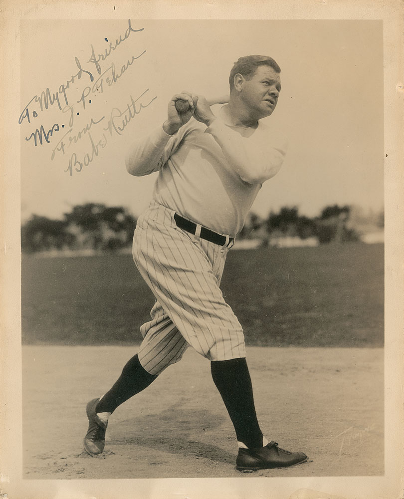 Highly desirable vintage matte-finish 8 x 10 full-length photo of Ruth posing at the end of one of his mighty swings, signed and inscribed in fountain pen, “To my good friend, Mrs. J. P. Tehan, From, Babe Ruth.” Mild scattered soiling, a tack hole to the right edge, and slight rippling to top edge, otherwise fine condition. Accompanied by a full letter of authenticity from JSA. A fantastic pose of the ‘Sultan of Swat.’ Pre-certified Steve Grad/PSA/DNA and RR Auction COA.