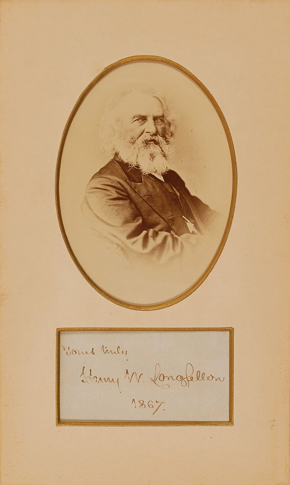 Ink signature, “Yours truly, Henry W. Longfellow, 1867,” on an off-white 3.5 x 2 slip. Matted with an unsigned original cabinet photo of Longfellow by Elliott and Fry to an overall size of 6.25 x 10.5. In fine condition. RR Auction COA.