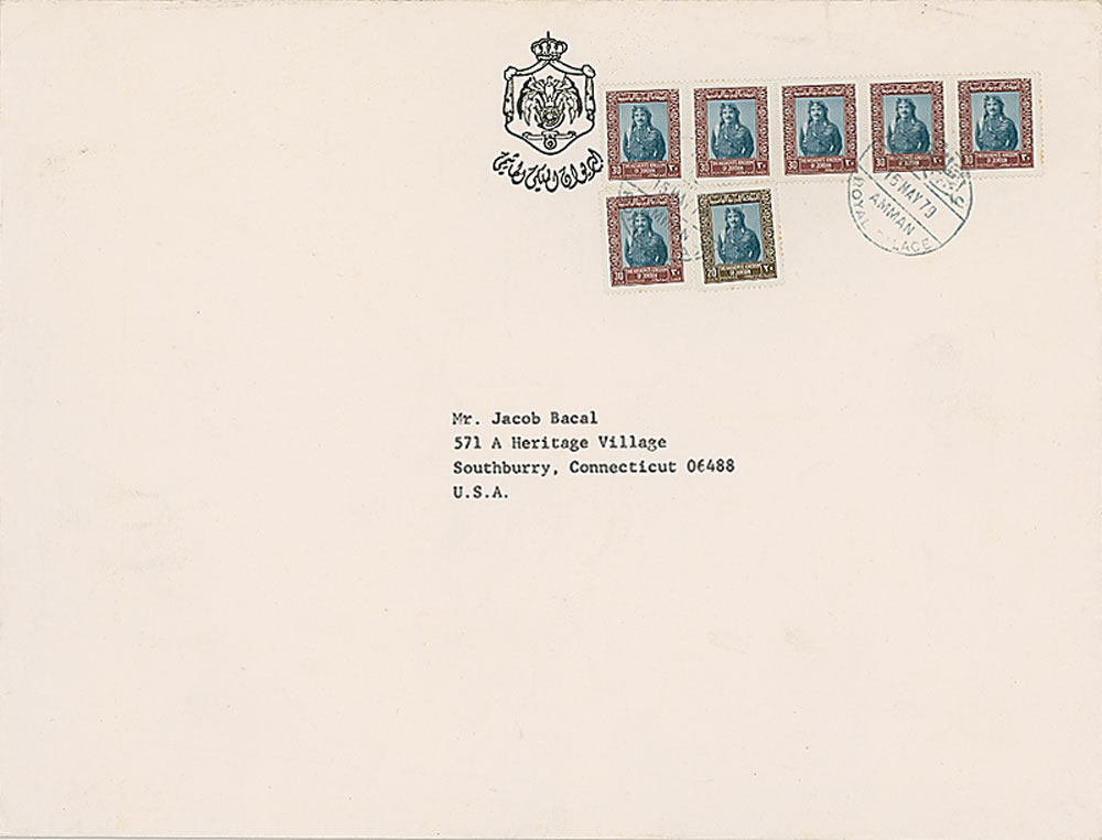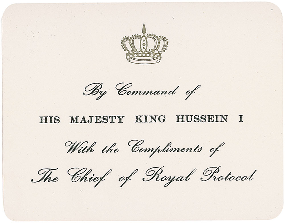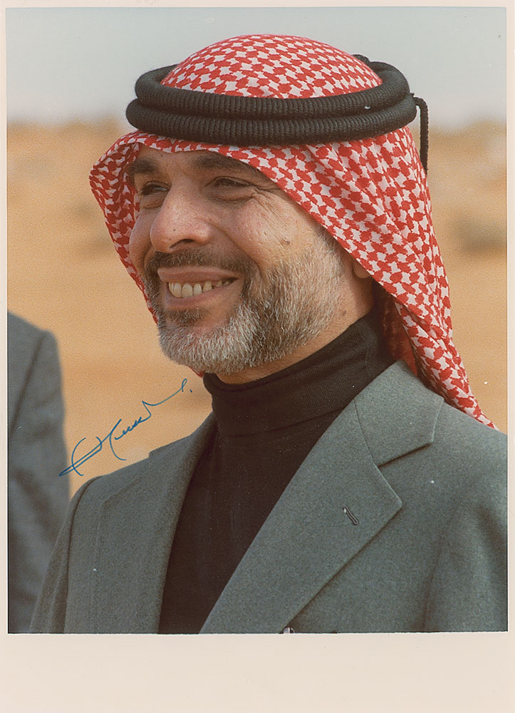 Color satin-finish 7.75 x 10.75 photo of King Hussein, signed in blue felt tip. In fine condition. Accompanied by a transmittal card from his office and the original mailing envelope. RR Auction COA.