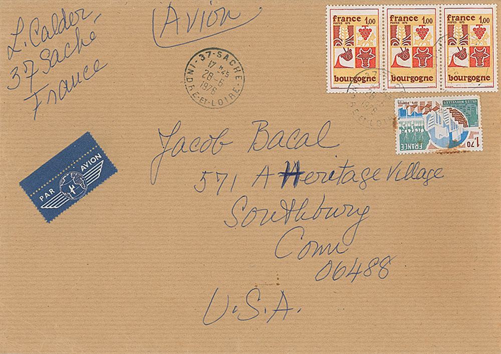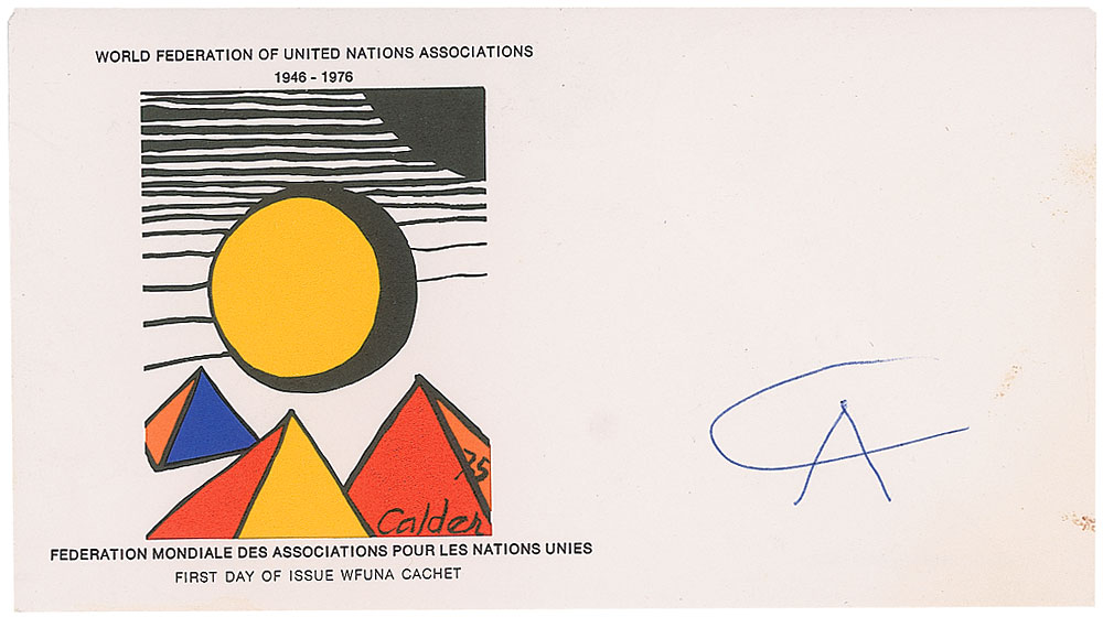Calder-designed commemorative cover with a cachet honoring the World Federation of United Nations Associations, signed in blue ballpoint, “AC.” In fine condition, with trivial soiling to the right side. Accompanied by the original mailing envelope. RR Auction COA.