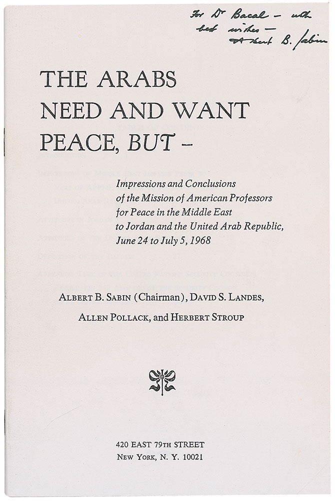 Two items: one FDC with a cachet honoring the Mayo brothers, signed in black felt tip, “Jonas Salk”; and one booklet entitled ‘The Arabs Need and Want Peace, But,’ 6 x 9, 31 pages, signed and inscribed in black felt tip, “For Dr. Bacal—with best wishes—Albert B. Sabin.” In overall very fine condition. RR Auction COA.