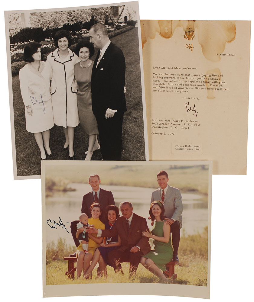 Three items: one matte-finish 8 x 10 photo of Johnson with his wife and daughters, signed in blue ballpoint, “L. B. J.”; one color glossy 10 x 8 photo of Johnson with his family, boldly signed in fountain pen, “L. B. J.”; and one TLS signed “L. B. J.,” one page, 7 x 9, personal presidential letterhead, October 6, 1972. In part: “You can be very sure that I am enjoying life and looking forward to the future, just as I always have…The faith and friendship of Americans like you have sustained me all through the years.” In overall very good condition, with scattered creases to the color photo, and heavy dampstaining, toning, and soiling to the letter. Accompanied by the letter’s original mailing envelope. RR Auction COA.