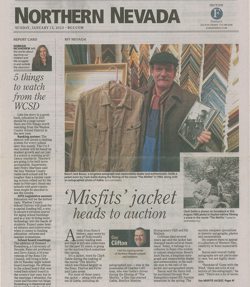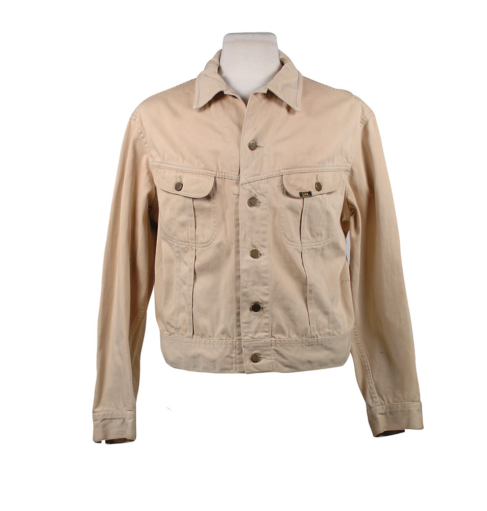 Gable’s screen-worn jacket from The Misfits. Beige western-style jacket has six metal buttons on the front, two breast pockets, and bears a Lee Westerner manufacturer’s label, is 100% cotton, and is a size 46 Regular. Accompanied by a photo of Gable on the set in the jacket posing with the recipient of the jacket. Also accompanied by a matte-finish 8 x 10 photo of Gable from The Misfits, signed and inscribed in blue ballpoint, “To Charles [Coffman] & Evelyn, Best wishes always, Clark.” In fine condition, with a bit of expected light wear and soiling to jacket.