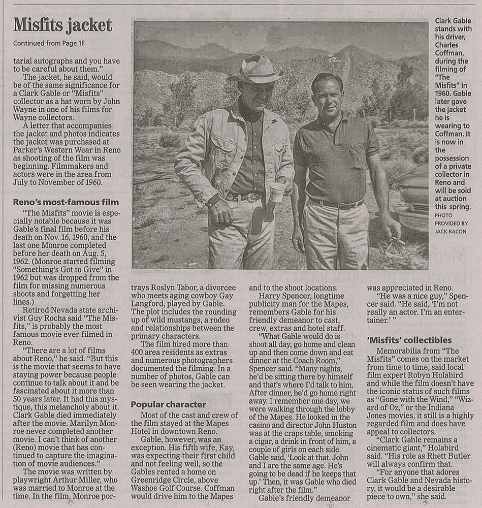Incredible screen-worn Misfits jacket, with impressive photographic evidence of Gable wearing it on set with its recipient—his driver during filming