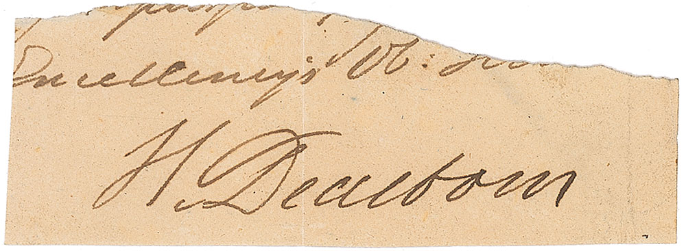 Ink signature, “H. Dearborn,” on an off-white 3.75 x 1.25 slip. In fine condition, with a rough top edge, partial line of text above signature, and a bisecting vertical fold, one through a single letter of signature. RR Auction COA.