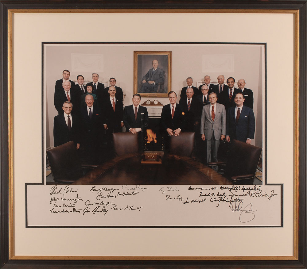 Color satin-finish 23.25 x 16.25 photo of Reagan and his cabinet posing together below a portrait of Eisenhower, signed in the lower border in black felt tip by by Ronald Reagan, George Bush, George P. Shultz, Frank Carlucci, Bill Verity, Jim Burnley, Lauro Cavazos, Don Hodel, Ken Duberstein, Ann McLaughlin, Richard Lyng, John S. Herrington, Joseph Wright, Vernon Walters, Clayton Yeutter, Nicholas Brady, Dick Thornburgh, Samuel Pierce, Otis Bowen, and Beryl Sprinkel. Attractively double-matted and framed to an overall size of 28.25 x 24.5. In fine condition, with some light soiling to the right border, slightly affecting one signature. The photo is affixed to an identical size piece of foamcore, with dampstaining and light foxing to the right border, of which has been matted out for an attractive presentation. A highly desirable and scarce example—just the second we have encountered. Oversized. Pre-certified John Reznikoff/PSA/DNA and RR Auction COA.