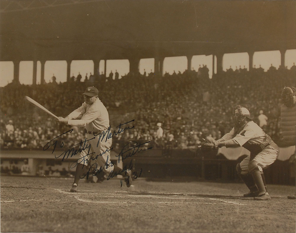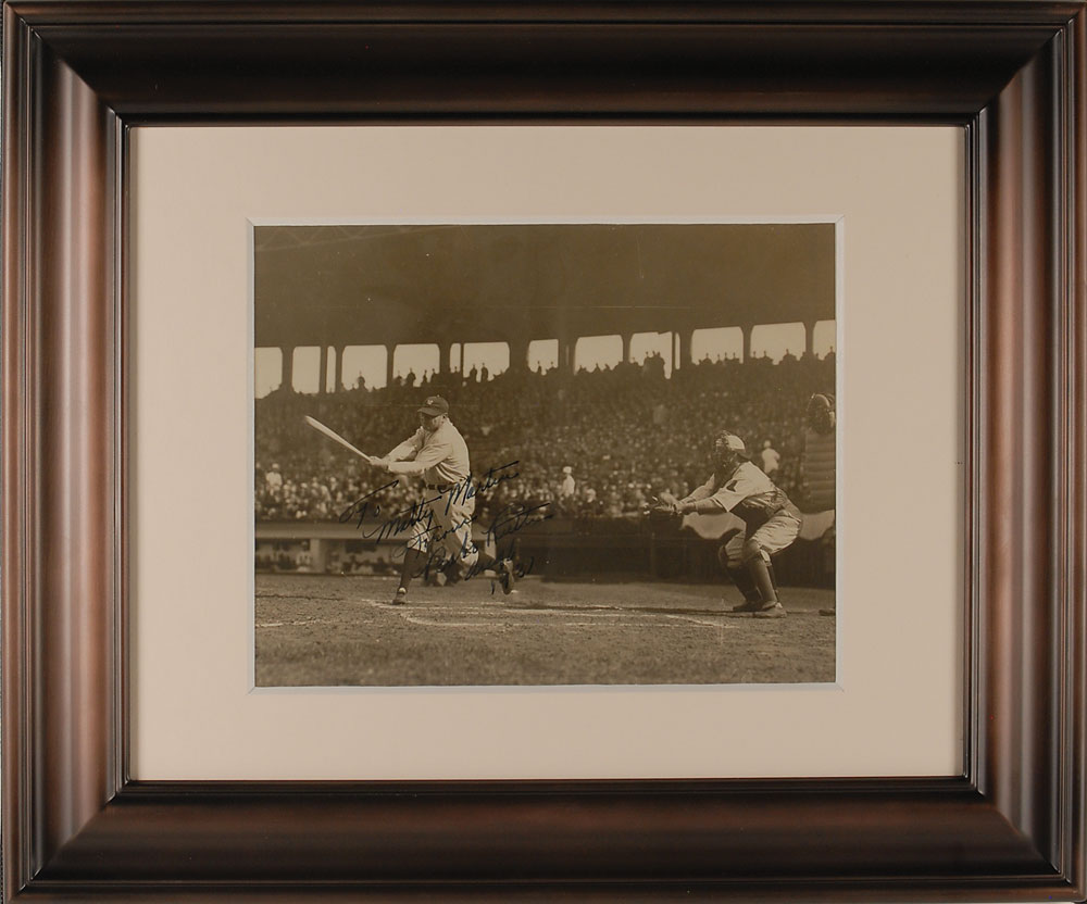 Vintage 9.25 x 7.5 game photo of Ruth taking a swing against his old team, the Boston Red Sox at Fenway Park in 1931, signed and inscribed in fountain pen “To Matty Martin from Babe Ruth, Aug 6, 1931.” Matted and framed to an overall size of 17.75 x 14.5. In fine condition. While Ruth signed many photos during his lifetime, actual game action photos signed by the Bambino are by far the scarcest and most desirable of all. Against his former team the Red Sox, this is an item of the utmost rarity. Accompanied by a full letter of authenticity and grading from PSA/DNA, grading the autograph a “9.” RR Auction COA.