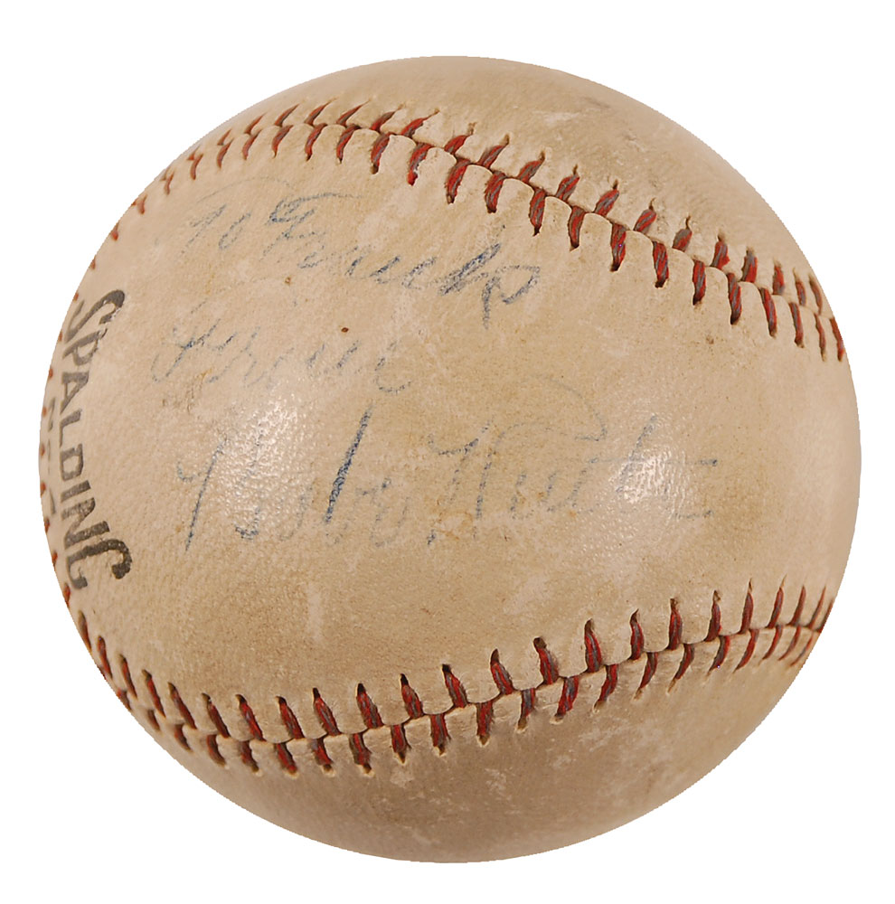 Official Spalding No. 4 ‘Match Ball’ baseball signed and inscribed in blue ink on a side panel, “To Frank, From, Babe Ruth.” Signature and inscription fairly light due to irregular ink adhesion and fading, but mostly legible, and scattered dings and scuffs to leather, otherwise very good condition. A collectible example of the always highly desirable single-signed vintage Ruth baseball. Pre-certified Steve Grad/PSA/DNA and RR Auction COA.