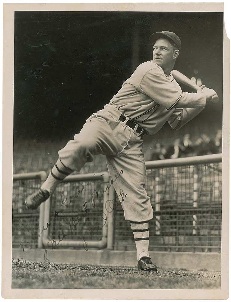 Rare vintage glossy 6.5 x 8.5 photo of Ott amidst his powerful and unorthodox swing, signed and inscribed in fountain pen, “To Buck Greene, With Best Wishes, Mel Ott.” In very good condition, with minor paper loss to upper right corner, small tear to lower right border, and moderate contrast to inscription and signature against the busy background. Trivial flaws to right border could be easily matted out and in no way affect the extraordinarily sharp image. Without a doubt the most desirable pose of any Ott signed photo that we have seen. Pre-certified Steve Grad/PSA/DNA and RR Auction COA.