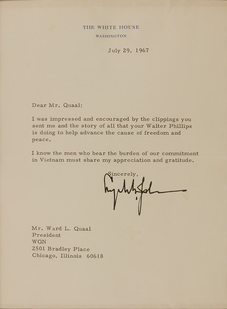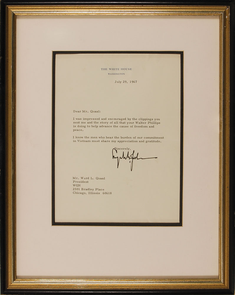TLS as president, one page, 6.25 x 9, White House letterhead, July 29, 1967. Letter to Ward Quaal at WGN in Chicago. In full: “I was impressed and encouraged by the clippings you sent me and the story of all that your Walter Phillips is doing to help advance the cause of freedom and peace. I know the men who bear the burden of our commitment in Vietnam must share my appreciation and gratitude.” Double-matted and framed to an overall size of 12 x 15. In fine condition, with a couple ripples near top edge. Pre-certified John Reznikoff/PSA/DNA and RR Auction COA.