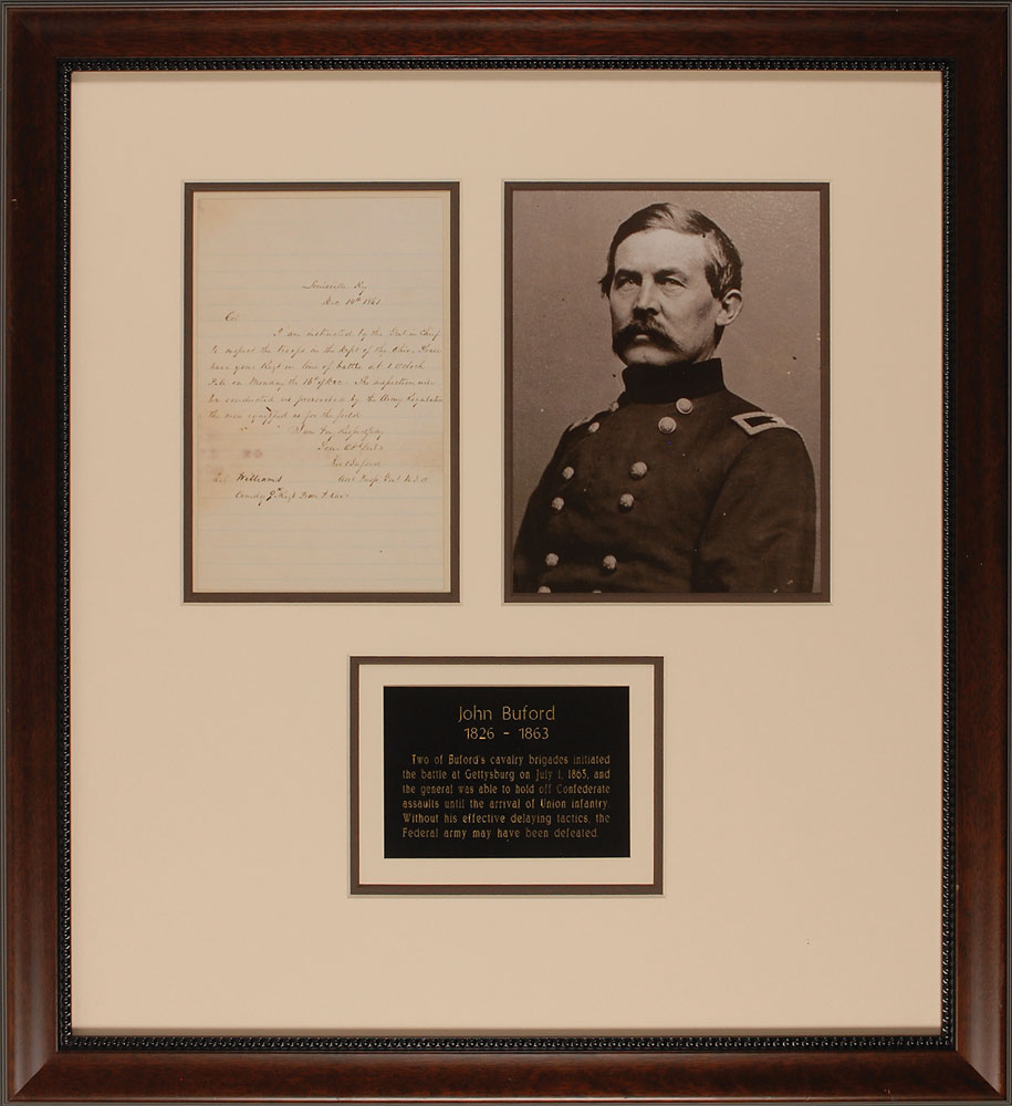 Union general (1826–1863). On July 1, 1863, at Gettysburg, it was Buford's troopers that fired the first shots of the battle. He was stricken with typhoid fever during the Rappahannock campaign and died in Washington on December 16, 1863. His commission of major general was presented to him on his deathbed. War-dated ALS signed “Jno Buford, Asst. Insp. Genl U.S.A.,” one page, lightly-lined, 5 x 8, December 14, 1861. Letter to Colonel Edward C. Williams of the 9th PA Cavalry. In full: “I am instructed by the Genl-in-Chief to inspect the troops in the Dept. of the Ohio—Please have your Regt. in line of battle by 1 o’clock P.M. on Monday. The inspection will be conducted as prescribed by the Army Regulation. The men equipped as for the Field.” Double-matted and framed with a portrait of Buford and a biographical plaque to an overall size of 20.5 x 22.5. An area of mild dampstaining to lower portion, with some over signature, but in no way affecting legibility, otherwise fine condition. Oversized. RR Auction COA.