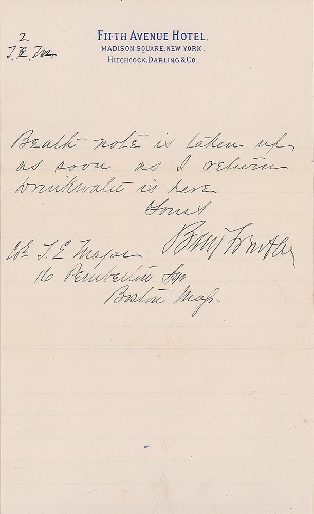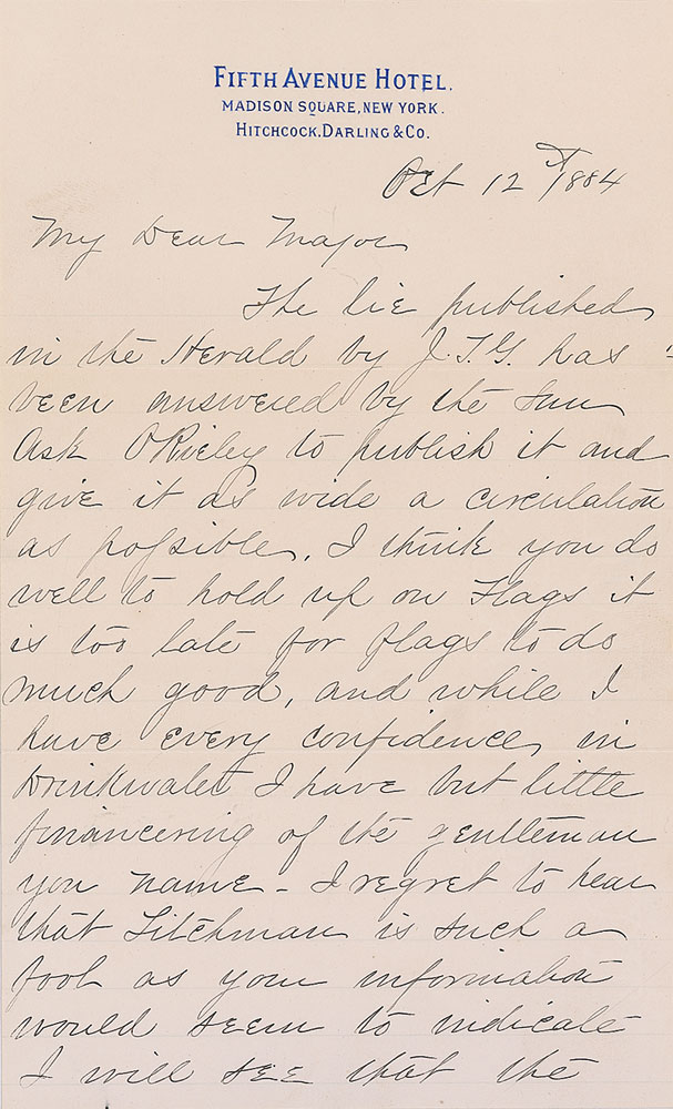 American military officer, lawyer, and politician (1818–1893) whose strict administration of New Orleans following the Union occupation in 1862 made him one of the most controversial figures of the Civil War. His mismanagement as a general ultimately led to his resignation in 1865, which was followed by a long career in Congress. LS signed “Benj. F. Butler,” two pages, lightly-lined, 5.5 x 9, Fifth Avenue Hotel letterhead, October 12, 1884. Letter to Colonel T. E. Major. In part; “The lie published in the Herald by J. T. G. has been answered by the Sun. Ask O’Reilly to publish it and give it as wide a circulation as possible. I think you do well to hold up on Flags it is too late for flags to do much good and while I have every confidence in Dinkwalet I have but little financing of the gentleman you name—I regret to hear that Litchman is such a fool as your information would seem to indicate. I will see that the Beath note is taken up as soon as I return.” In fine condition. Butler was running for president as a member of the Greenback and Anti-Monopoly parties. A great letter from the end of Butler’s political career, as he provides damage control shortly before the election. RR Auction COA.