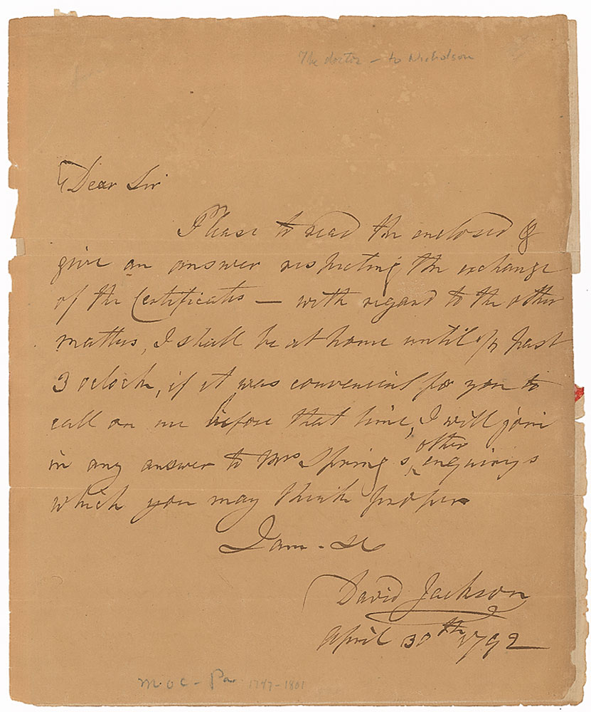 Physician and Continental Congress delegate (1747–1801). ALS, one page, 7.5 x 9.25, April 30, 1792. Letter to John Nicholson. In part: “Please to read the enclosed & give an answer respecting the exchange of Certificates.” In good condition, with intersecting folds, several passing through signature, a few partial separations, uniform toning, and a couple pencil notations. RR Auction COA.