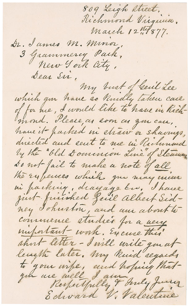Sculptor (1838–1930) known for his bronze and marble sculptures of Stonewall Jackson, Robert E. Lee, and Thomas Jefferson. ALS, one page, 5 x 8, Richmond, Virginia, March 12, 1877. Letter to James M. Minor. In part: “My bust of Gen’l Lee which you have so kindly taken care of for me, I would like to have in Richmond. Please, as soon as you can, have it packed in straw or shavings, directed and sent to me in Richmond…I have just finished Gen’l Albert Sidney Johnston, and am about to commence studies for a very important work.” In fine condition, with slight overall brushing to ink. One of Valentine’s full-length sculptures of Lee resides in the National Statuary Hall Collection at the US Capitol. RR Auction COA.