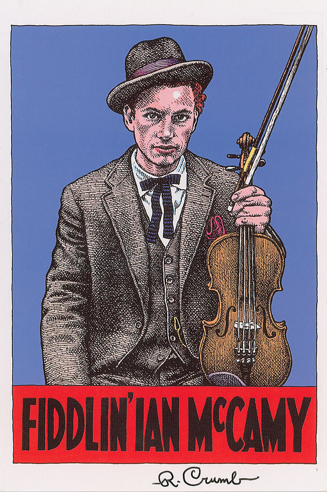 Color 4 x 5.75 postcard featuring Crumb’s work, Fiddlin’ Ian McCamy, signed in the lower border in black ink, “R. Crumb.” In very fine condition. RR Auction COA.