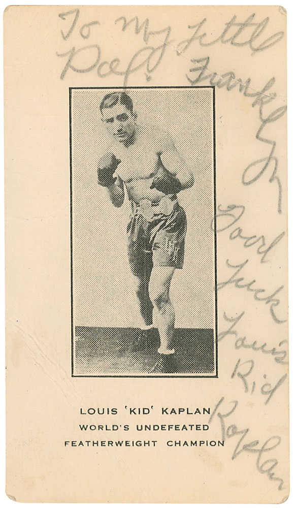 Boxing Hall of Famer (1901–1970) considered one of the best Ukranian boxers. Vintage boxing card featuring a full-length image of Kaplan in a pugilistic pose, 2 x 3.5, likely issued by a tobacco or candy company in the 1930s, signed and inscribed in pencil, “For my little pal Franklin, Good luck, Louis Kid Kaplan,” affixed to a page within a black leatherette autograph album. Other signers within the book include: Stella Walsh, Carl Hubbell, Rip Collins, Eddie Mayo, Johnny Moore, Glenn Cunningham, Sam Leslie, Wally Berger, Mickey Haslin, Aaron Robinson, Norman ‘Red’ Branch, and Bill Johnson. Kaplan card in very good condition, with scattered creasing; other pages in very good to fine condition. Pre-certified Steve Grad/PSA/DNA and RR Auction COA.