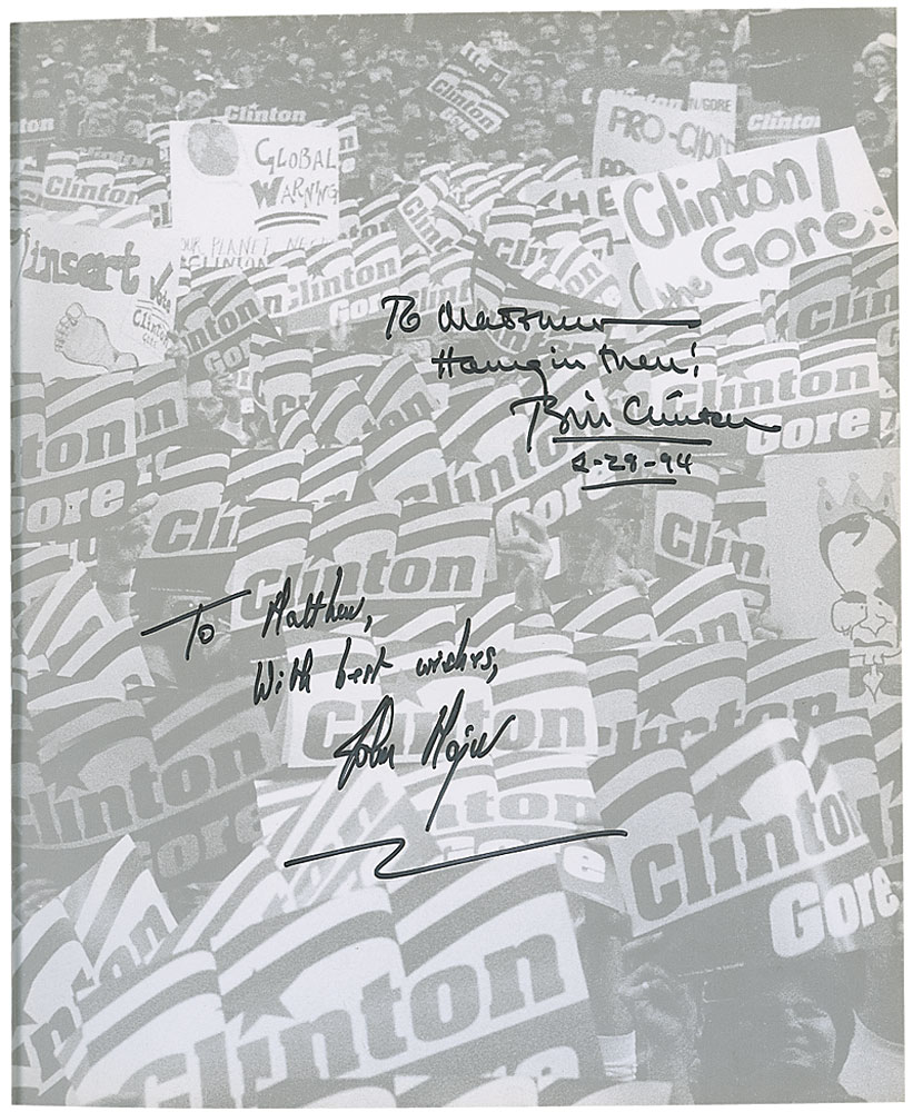 Signed book: Clinton: Portrait of Victory. First edition, first printing. NY: Warner Books, 1993. Hardcover with dust jacket, 9.25 x 11, 127 pages. Signed and inscribed in black felt tip on the first free end page, as president, “To Matthew, Hang in there! Bill Clinton, 2-28-94,” and “To Matthew, With best wishes, John Major.” In fine condition. Consignor notes that this book was signed in person in Pittsburgh on February 28, 1994. RR Auction COA.