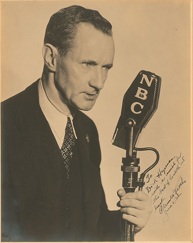Sportscaster and public address announcer (1882–1962) known for his dramatic style who also lent his voice to Pathe News' RKO newsreels. Scarce vintage matte-finish 7.5 x 9.5 portrait of McCarthy with his NBC microphone, signed and inscribed in fountain pen, “To Dick Hyman, with a wish for the best of health and luck, Clem McCarthy, June 3, 1936.” In fine condition, with slight silvering to the lower left and lightly trimmed edges. Pre-certified Steve Grad/PSA/DNA and RR Auction COA.